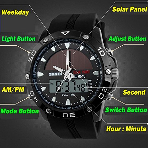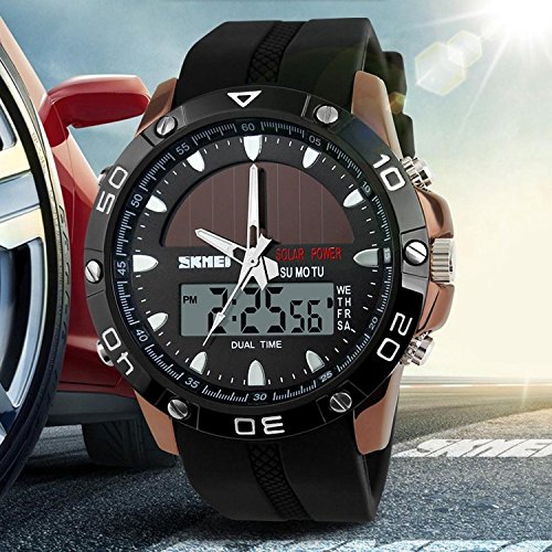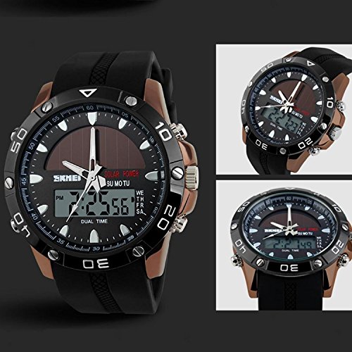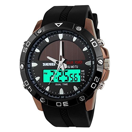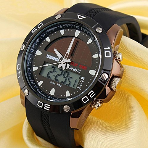 -. Title : Gosasa Men's Solar Power Military Dual Time Zones Slide Rule Silicone Band Sports Wrist Watch (Coffee)