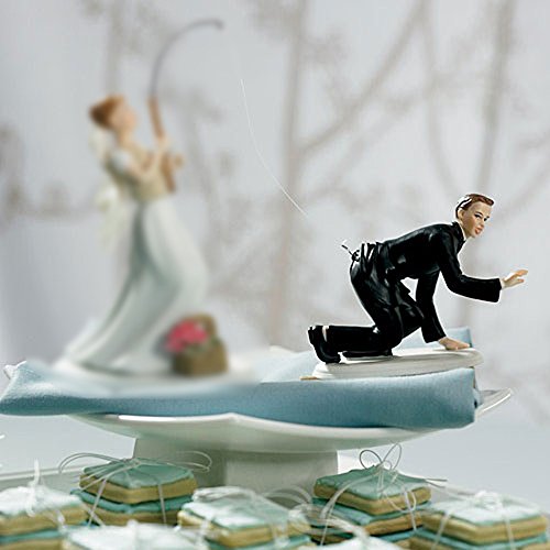 This takes the saying "Gone Fishing" to a whole new level. Fun and playful, this cake top can be used with equally playful tied bundles of tiered cookies or currently popular cup cakes . Hand painted porcelain. Mix and match with our other interchangeable cake toppers! Presently the Groom Cake Toppers are available with skin tones and hair colors only as shown.
