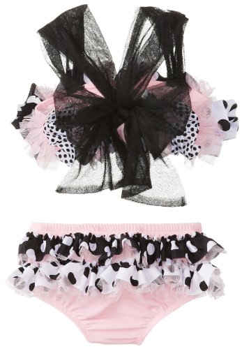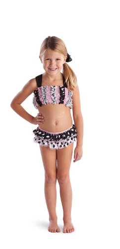 2-piece bikini features all over poly crepe and mesh ruffles. Bandeau style top has mesh straps tied in fancy bow at back. Spandex nylon base.
