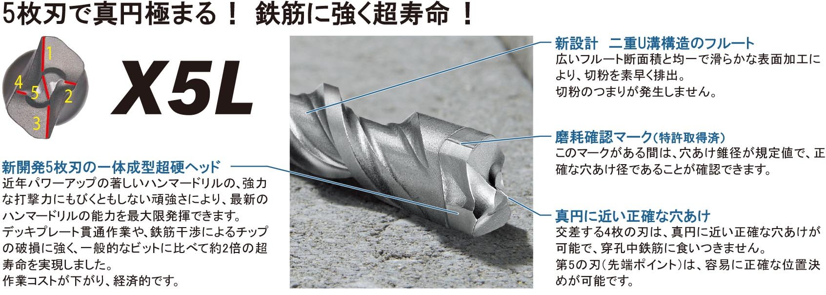 Realizes a drilling close to perfect circle and super life span resistant to rebar interference