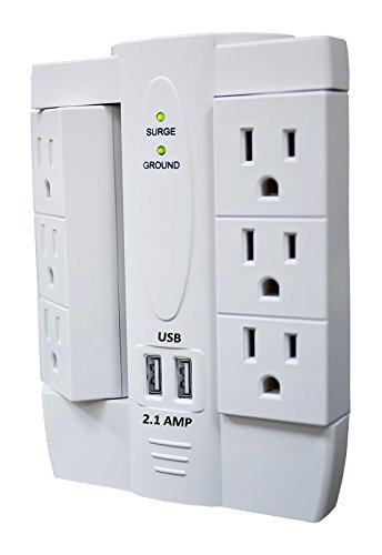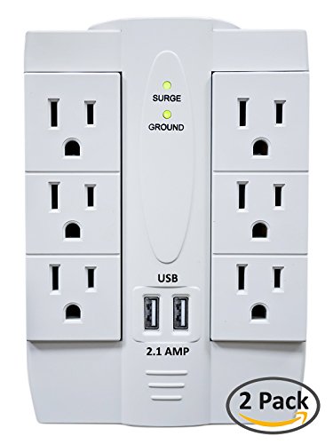 6 AC Outlet Power Surge Protector with 2 Ports USB Wall Charger 2.1Amp and Swivel Sockets - White (2 Pack)