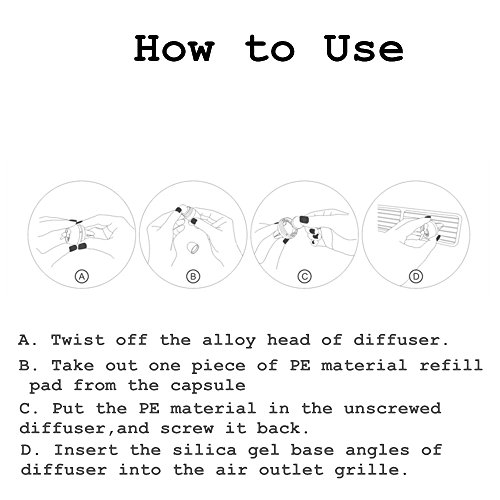 How To Use: A. Twist off the alloy head of diffuser. B. Take out one piece of PE material refill pad from the capsule. C. Put the PE material in the unscrewed diffuser, and screw it back. D. Insert the silica gel base angles of diffuser into the air outlet grille.