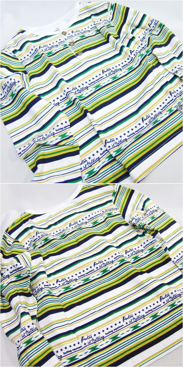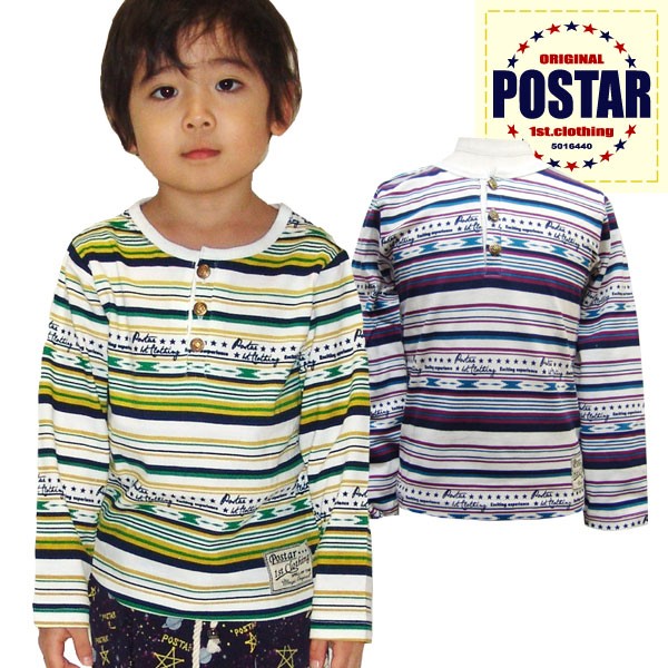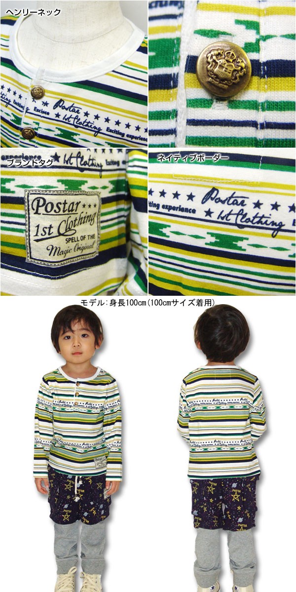 コメント:ボーダーがかっこいいヘンリーネックロンT!アウトドアコーデにおすすめ!※90cmは左肩スナップボタン付きです。