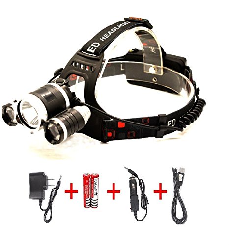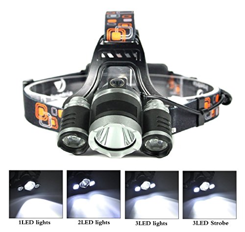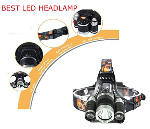 5000 Lumen 3 * T6 LED headlamp powered by 2 pieces of rechargeable 4200mAh batteries.