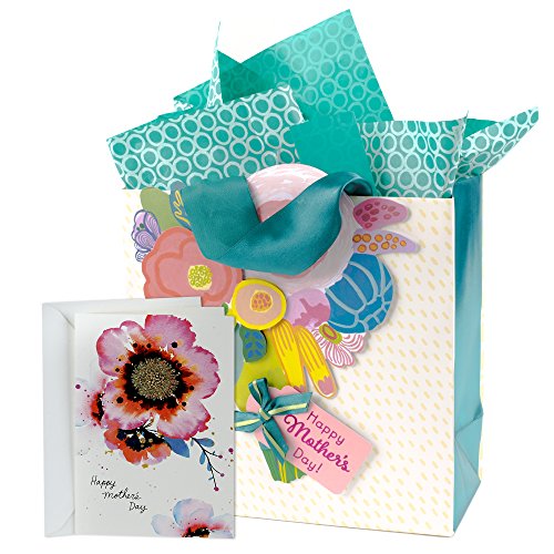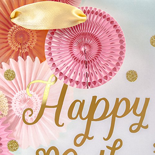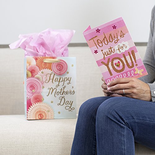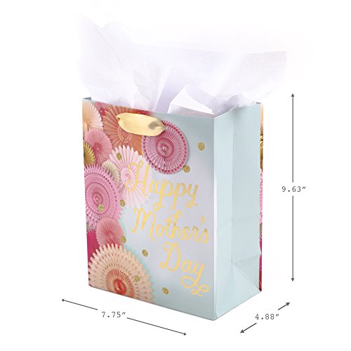 Dress up Mom's gift this Mother's Day with this gift bag with a gold satin ribbon handle and greeting card, both decorated in shades of pink and gold with glitter and foil accents. This medium-sized gift bag measures 7.75 inches wide by 9.63 inches high by 4.88 inches deep. Includes one gift bag with two sheets of pink tissue paper and one greeting card, perfect for a personalized gift of books, clothing, handheld electronics, and more. Hallmark gift bags are made with paper from well-managed forests. Hallmark was founded in 1910 when 18-year-old J.C. Hall arrived in Kansas City, Missouri, with a couple of shoeboxes of postcards under his arm and the American dream in his heart. Hallmark greeting cards are sold online and in nearly 40,000 retail stores across the globe and people continue to recognize the iconic Hallmark brand as "the very best."Feature