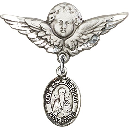 -. Title : Sterling Silver Baby Badge with St. Basil the Great Charm and Angel w/Wings Badge Pin 1 1/8 X 1 1/8 inches