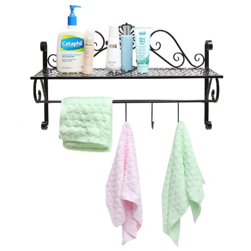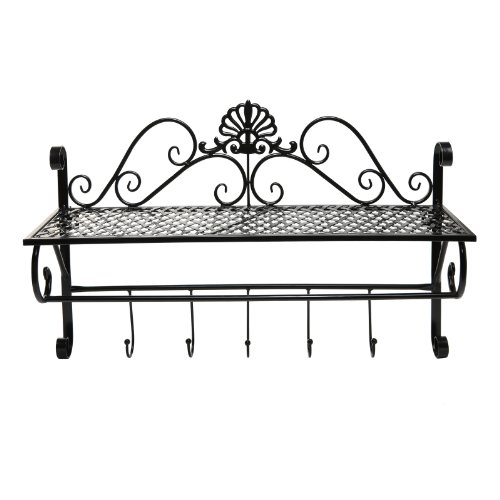 A decorative, wall-mounted storage rack with an elegant scrollwork design and a classic black finish.
