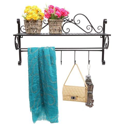 The latticework shelf at the top of this utility rack is ideal for storing and displaying small items, while the 4 ball-capped hooks below help keep hanging items like handbags, coats, scarves, and towels organized.
