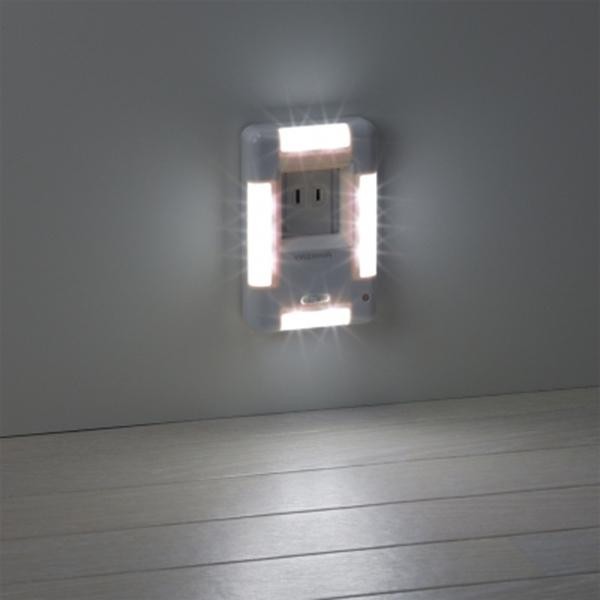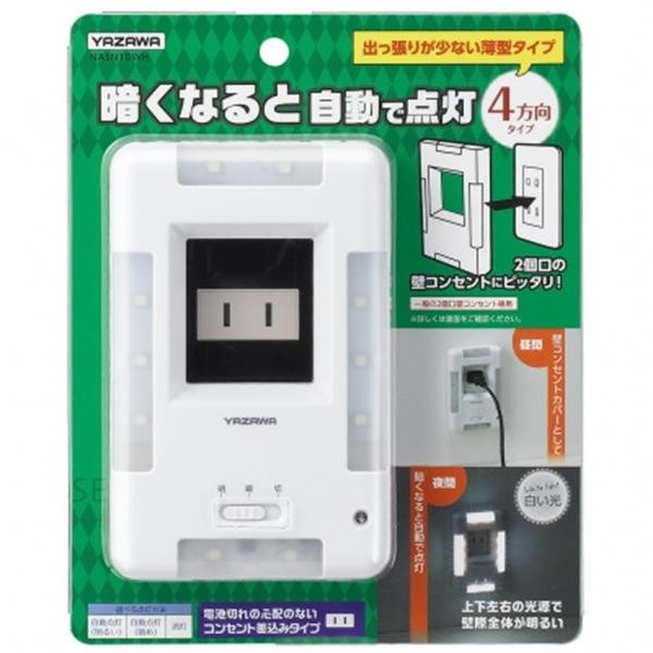 暗くなると自動で点灯。壁からの飛び出しが少ない!スリム型。 製造国:中国 素材・材質:ABS 商品サイズ:約(W)80×(H)127×(D)30mm 重量:約70g(本体のみ) 仕様:●点灯方式:明暗センサー●光源:白色LED×10灯●色温度:6000K●光源寿命:30.000h●使用電源:コンセント ※サプライヤー直送品 ご注文後2~3営業日後の出荷となります【商品名】YAZAWA(ヤザワコーポレーション) ナイトライト 明暗ウォール型 4方向タイプ NASN10WH