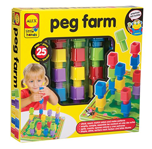 ALEX Toys Little Hands Peg Farm comes with 25 inter-locking pegs for your child to stack on a foam pegboard. Just grab the farm-themed board and stack the multicolored pegs on top of one another. The pegs can be stacked as high as your child would like to go to encourage sorting, patterns and colors. This toy is specifically designed for preschoolers to learn valuable skills in a fun way. Includes a 9.75in. x 9.75in. peg board and 25 pegs. Recommended for children 2 years of age and older.Feature
