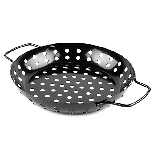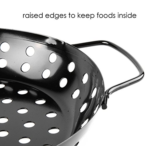 Waykea Non-stick Grill Wok with Handle, 9.5-inch Round Vegetable Basket Pan BBQ Accessory for Grilling Veggie, Chicken, Shrimp, Meat, Camping Cookware