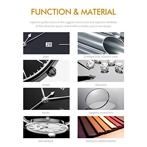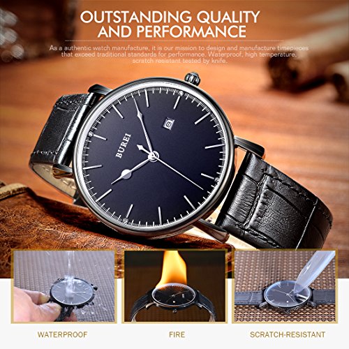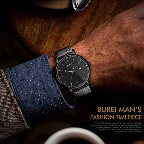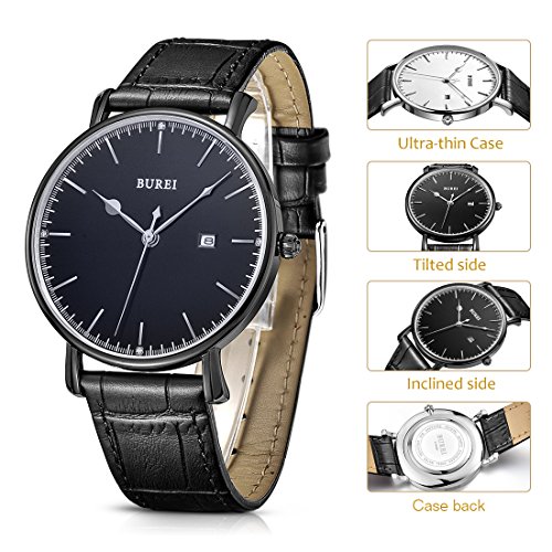 -. Title : BUREI® Unisex Ultradünnes Elegant Datum Quarz Armbanduhr mit schwarzen Kalbslederarmband Band, Schwarzes Ziffernblatt