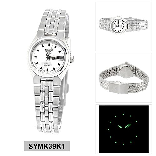 Stainless steel case with a stainless steel bracelet. Fixed stainless steel bezel. Silver dial with silver-tone hands and index hour markers. Minute markers around the outer rim. Dial Type: Analog. Luminescent hands and markers. Day of the week and date display at the 3 o'clock position. Automatic movement with a 24 hour power reserve. Scratch resistant Hardlex crystal. Pull / push crown. Solid case back. Case diameter: 24 mm. Case thickness: 10 mm. Round case shape. Band width: 10 mm. Fold over clasp. Water resistant at 30 meters / 100 feet. Functions: date, day, hour, minute, second. Casual watch style. Seiko 5 Automatic Silver Dial Stainless Steel Ladies Watch SYMK39.Feature
