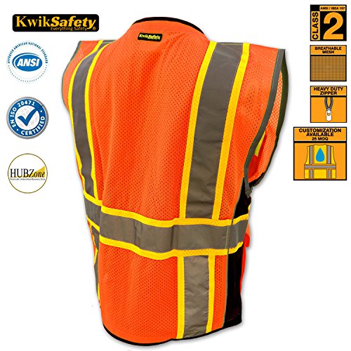 - HIGH VISIBILITY: Our KwikSafety Class 2 Executive Deluxe Safari Safety Vest are available in two bright fluorescent colors; orange and yellow. Paired with the vibrant color are multiple 2 inch wide Silver Reflective Tape that are positioned all along the Breathable Mesh Safety Vest to maximize visibility both day and night.