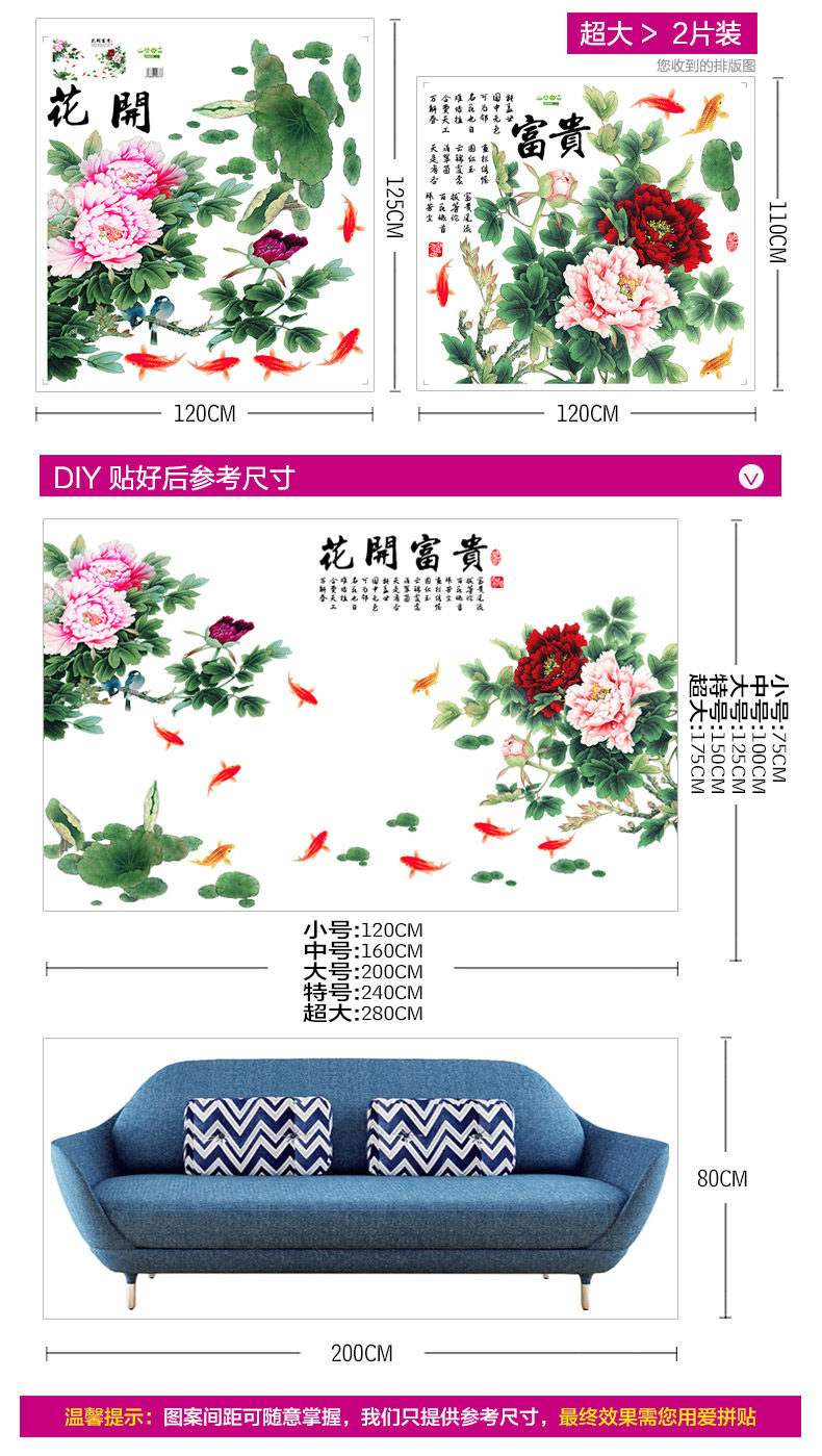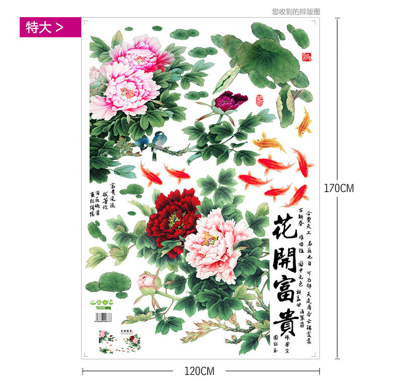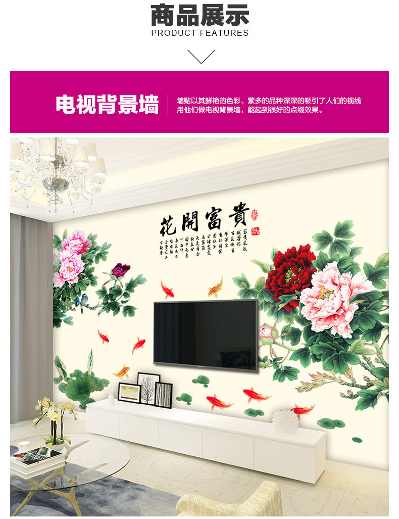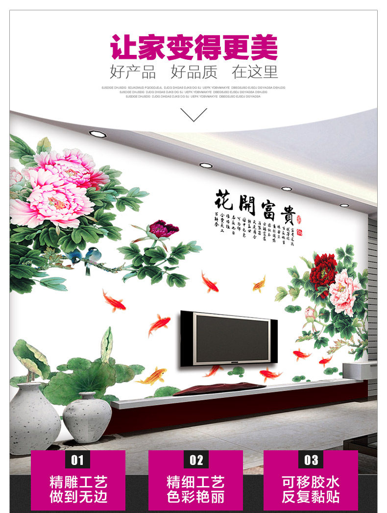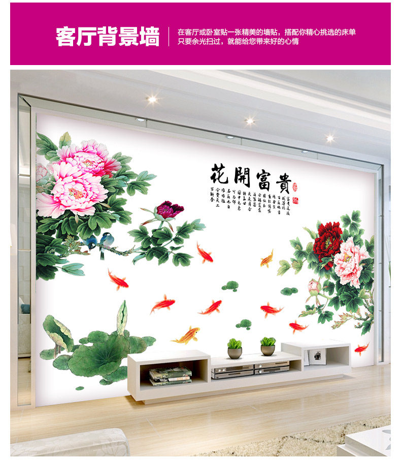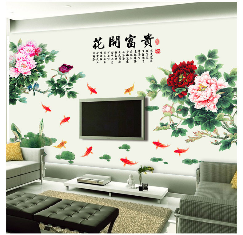 牡丹花中国风超大型墙贴画典雅客厅卧室装饰电视背景墙贴纸自粘