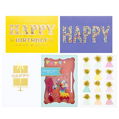This Hallmark Signature Birthday Greeting Card Set contains five different designs and messages, including: "HAPPY", "Birthday Party in a Box", and "Happy Birthday".