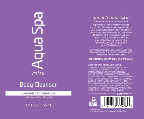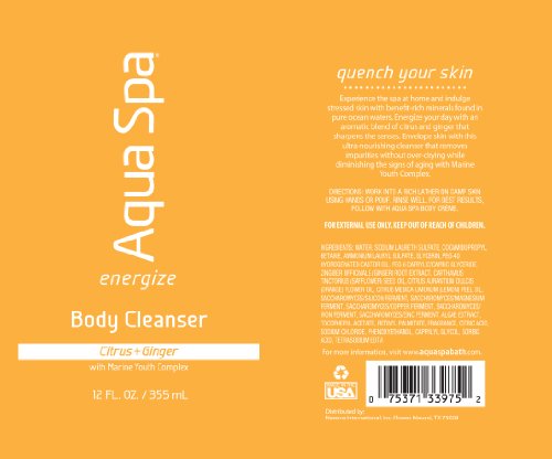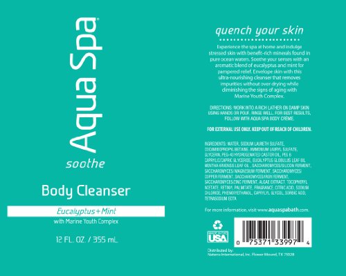 -. Binding : Health and Beauty -. Brand : Aqua Spa -. Label : Aqua Spa -. Manufacturer : Aqua Spa -. ProductGroup : Beauty -. ProductTypeName : BEAUTY -. Publisher : Aqua Spa -. Studio : Aqua Spa -. Title : Aqua Spa Body Cleanser, 12 Fluid Ounce