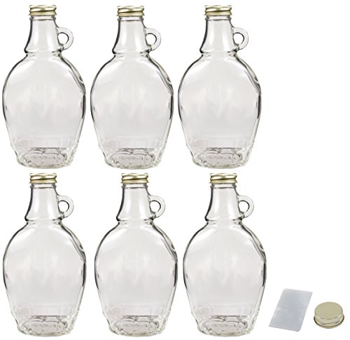 Bulk Glass Empty 8oz Syrup Bottle For Canning, 6 Pack with Metal Lids and Shrink Bands, Glass Maple Syrup Bottles 6 Pack of high quality empty glass 8oz maple syrup bottles, complete with metal lids and shrink bands. A 6 pack of complete 8oz syrup bottles, glass bottles with metal lids, perfect for canning maple syrup. Don't put your hard work into a plastic bottle, use our glass maple syrup bottles for bottling your syrups at home. Our high quality syrup bottles are great for canning and each include a metal lid, and a shrink band to finish them off after canning properly. And make other pancake syrups too to store in these high-quality bottles like strawberry or blueberry syrup.