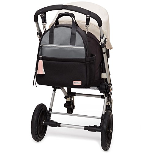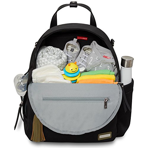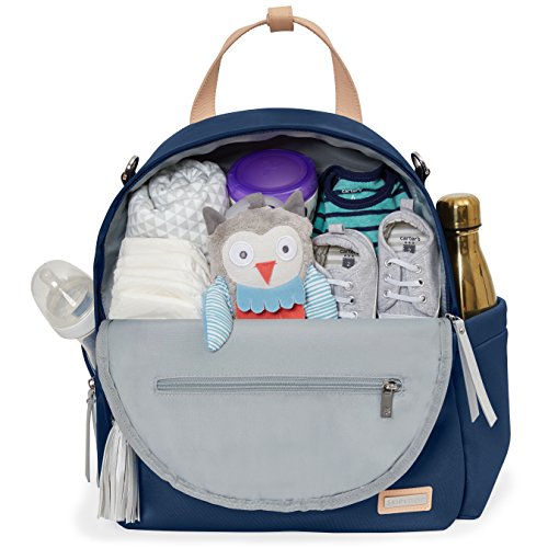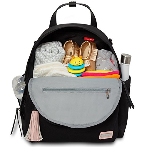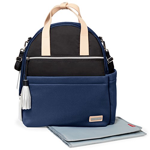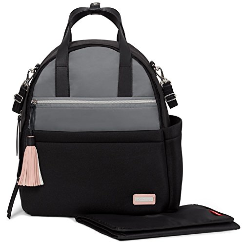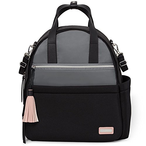 Product Description A rommy Skip Hop diaper bag backpack in two-tone neoprene. 4 exterior pockets. The wraparound zip opens to a lined, 3-pocket interior with an optional changing pad. Top handles, shoulder straps and stroller straps. 0