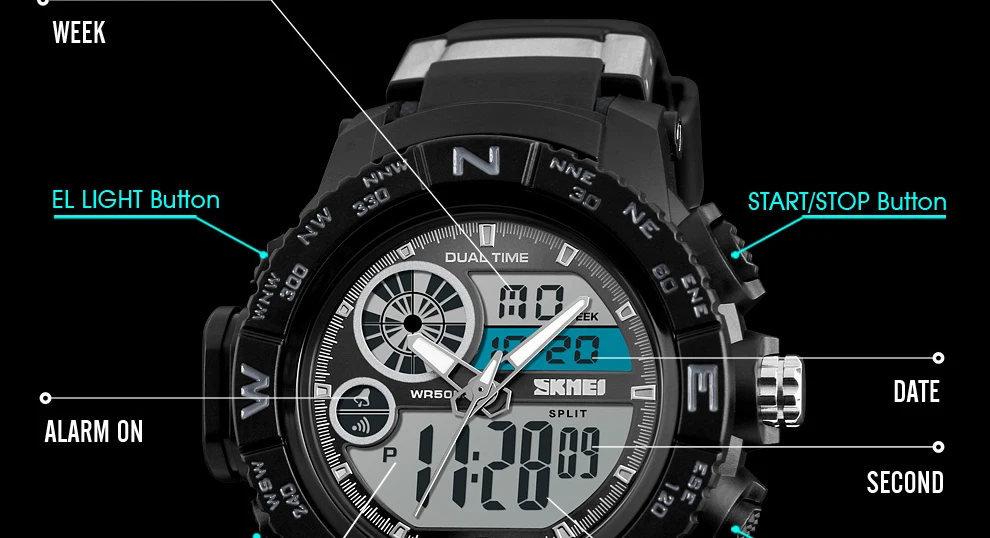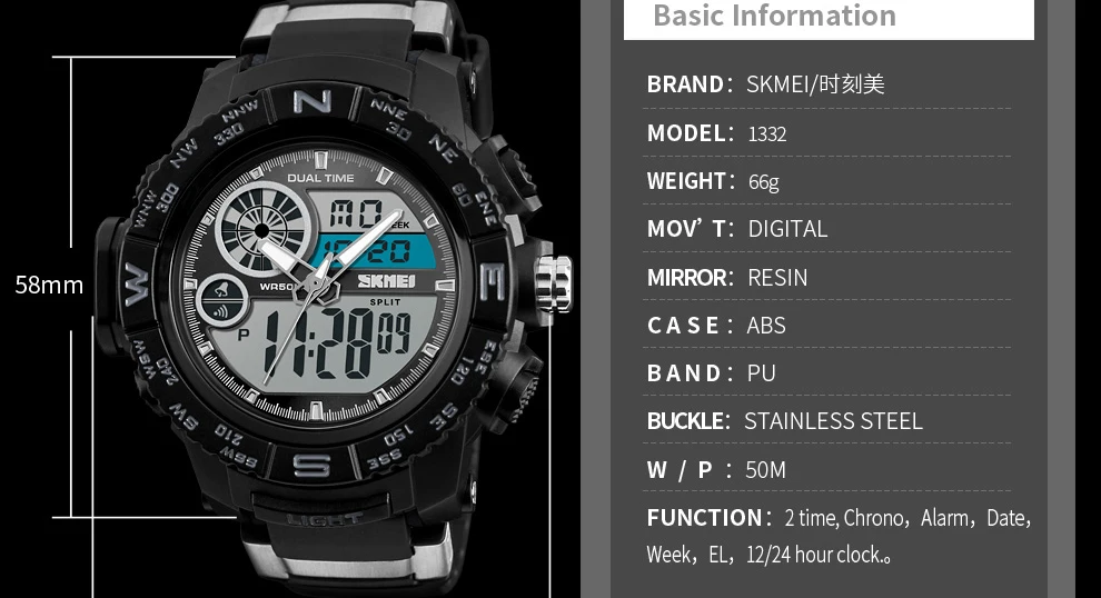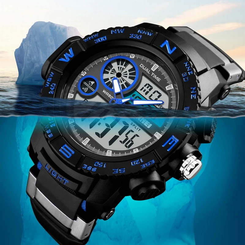 Feature:Water Resistant,LED display,Multiple Time Zone,Auto Date,Back Light,Week Display,Alarm,Chronograph