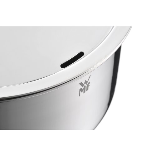 -. Feature : Stielkasserolle Ø 20 cm mit Deckel aus der WMF Serie "Chef's Edition" / 3-Schicht-Material: Innenseite Cromargan®:Edelstahl Rostfrei 18/10, Aluminiumkern, Außenseite Chromstahl / Schwerer Edelstahl-Aufliegedeckel mit Dampfaustrittsöffnung für kontrollierten Dampfaustritt und Vermeidung von Spritzwasser auf dem Herd / Innenskalierung für genaues Dosieren, für alle Herdarten geeignet / Backofengeeignet bis 200 °C, spülmaschinenbeständig