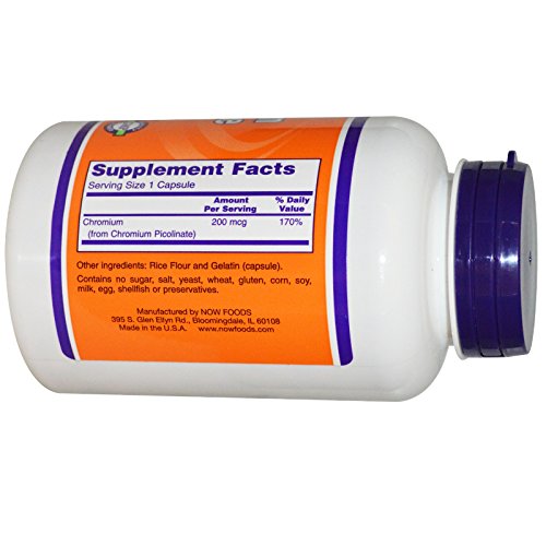 Studio : Now Foods Publisher : Now Foods Binding : Health and Beauty Product Description Chromium Picolinate 200 mcg 250 caps Dietary Supplement - Insulin Co-Factor - Supports Healthy Blood Sugar Levels* Supplement Facts Serving Size: 1 Capsule Servings Per Container: 250 Amount per Serving Chromium (from Chromium Picolinate 200 mcg Other Ingredients: Rice Flour and Gelatin (capsule). Contains no sugar, salt, starch, yeast, wheat, gluten, corn, soy, milk, egg, shellfish or preservatives. SUGGESTED USAGE: As a dietary supplement, take one tablet daily, preferably with meals. Diabetics: Use only under a physician's supervision. Store in a cool, dry place. *These statements have not been evaluated by the FDA. This product is not intended to diagnose, treat, cure or prevent any disease. 0