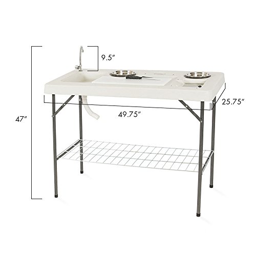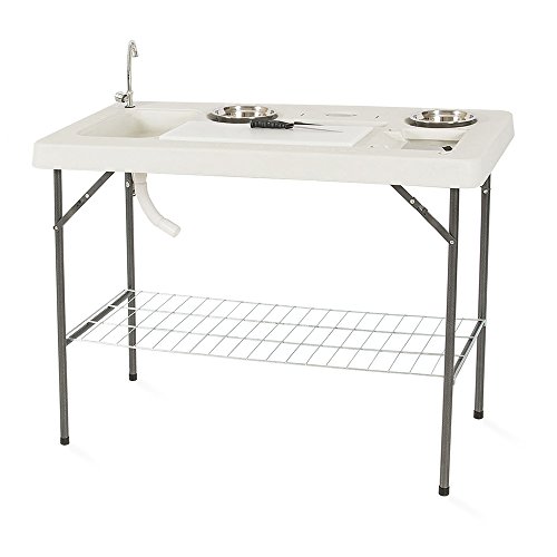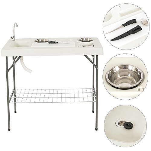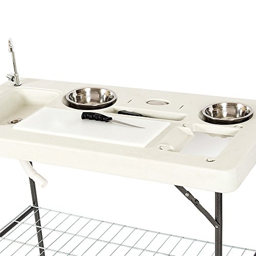 This folding fish cleaning camp table with flexible faucet and accessories is portable and easy to move and set up, so you can clean your catches without mess or hassle. Plus, it's great for tailgating or backyard parties. It features a flexible sprayer faucet that hooks up to a standard garden hose to provide fresh water and allows you to empty the sink into a bucket or floor drain to minimize cleanup. Features: 1. Recommend for food preparation, game cleaning, BBQ prep, picnics, camping, fishing and almost any kind of outdoor activity 2. Folding legs for easy storage 3. Durable plastic station top 4. Built-in ruler for measurement 5. Built-in place settings for two bowls 6. Odor removing bar to remove any unwanted smells or odors from your hands after handling things such as onion, garlic, fish etc. 7. Anti-slide textured surface 8. Built-in garbage hole 9. Stainless steel faucet that can be easily hooked to a garden hose 10. Tapered channel for water drainage, drain hose and built in ruler located on top of the table Specifications: 1. Material: HDPE Spraying Plastic Steel Tube 2. Foot Tube Size: 25*1mm 3. Dimensions: 49.80" x 25.59" x 37.20" (L x W x H) 4. Fillet Knife: 11" Overall Length; 6-1/4" Blade Length 5. Table Height: 37.20" 6. Table Thickness: 2.95" 7. Weight: 33.29lb Package Includes: 1 x Fish Table 2 x Bowls 1 x Fillet Knife 1 x Odor Removing Bar 1 x Chop Board 1 x Faucet 1 x Hose Connection 1 x Fast Connection 0 |