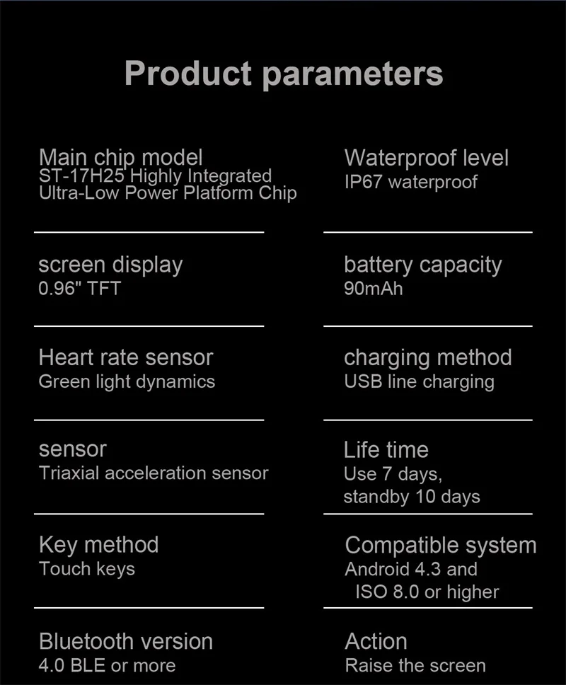 Function:Blood Pressure,Passometer,Sleep Tracker,Countdown,Push Message,Blood Oxygen,Heart Rate Tracker,Alarm Clock,Remote Control,Activity Tracker,Fitness Tracker,Message Reminder,Week,Call Reminder