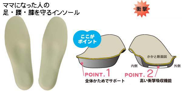 | 出産後の運動量増加に対応、高い衝撃吸収機能、さらに全体をやや硬目に仕上げました。3つのアーチサポートパッドで骨格構造をサポート。 |