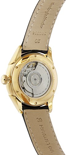 Studio : Hamilton Publisher : Hamilton Binding : Watch Product Description Rose gold-plated stainless steel case with a black leather strap. Fixed rose gold-plated bezel. Grey dial with luminous rose gold-tone hands and index hour markers. Minute markers around the outer rim. Dial Type: Analog. Luminescent hands and markers. Date display at the 6 o'clock position. Seconds sub-dial above the 6 o'clock position. Automatic movement. Scratch resistant sapphire crystal. Pull / push crown. Skeleton case back. Case diameter: 40 mm. Case thickness: 11 mm. Round case shape. Band width: 20 mm. Band length: 7.5 inches. Tang clasp. Water resistant at 50 meters / 165 feet. Functions: date, hour, minute, second. Dress watch style. Watch label: Swiss Made. Hamilton Jazzmaster Maestro Automatic Grey Dial Black Leather Mens Watch H42575783. 0