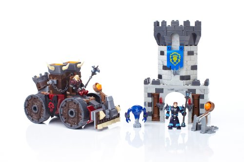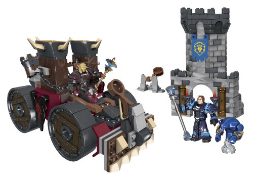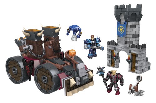 -. Feature : Buildable Horde Demolisher siege engine with catapult launcher, spinning wheels and projectiles. / Buildable Alliance fort tower with catapult launcher. / Buildable Human Warlock micro action figures with customizable gear and exclusive Void Walker minion. / Buildable Blood Elf Death Knight micro action figure with interchangeable Scourgelord armor. / Includes random loot - alternate armor or weapon - in each set!
