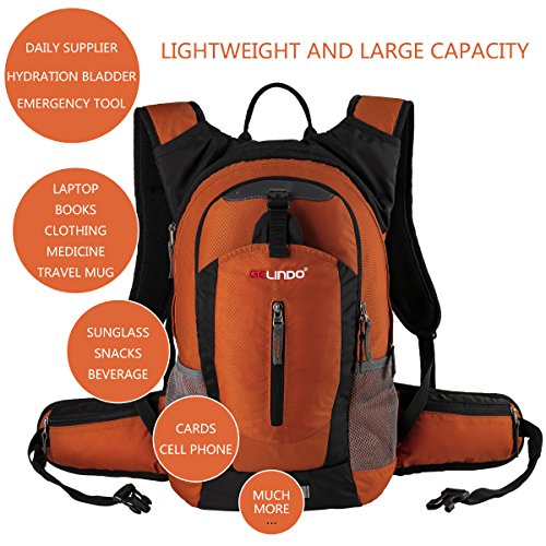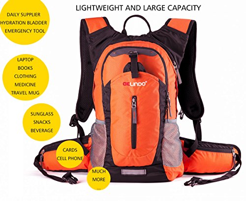 Perfect Companion for Daily Use Outdoor Adventures Looking for an awesome daypack or a practical gift for your family or friends? This daypack is definitely your best choice. The lightweight daypack with a large capacity and stylish look works great for outdoor adventures like running, cycling, fishing and hiking or leisure activities in or out of the city. Furthermore, With the hydration reservoir compartment that works great for 2.5L bladder and can keep liquid cool for at least 4 hours, this pack can also be used as a cooler bag. Why Choose Gelindo Daypack: - Lightweight with large capacity, perfect for day-to-day use or occasional travel. - Comes together with a 2.5L hydration bladder to give your extra bonus. - With the open assistant compartment you can conveniently store your quick-dry sweat towel, umbrella or hat - Two extra pockets on the wide waist straps are specially designed for easy and safe access of your valuables -Hydration reservoir compartment works great for 2.5L bladder and can keeps your liquid cool for up to 4 hours - Safety reflectors on the shoulder straps and front side of the backpack - Shock absorbing chest strap and built-in safety whistle for any urgent use - Adjustable shoulder/chest/waist straps for a customizable fit - Hidden-teeth zippers and durable water-resistant nylon material - Breathable shoulder straps and mesh ventilated back promise an enjoyable and comfortable carry - 100% satisfaction guarantee. Great gift for your family or friends, for both men women. 0
