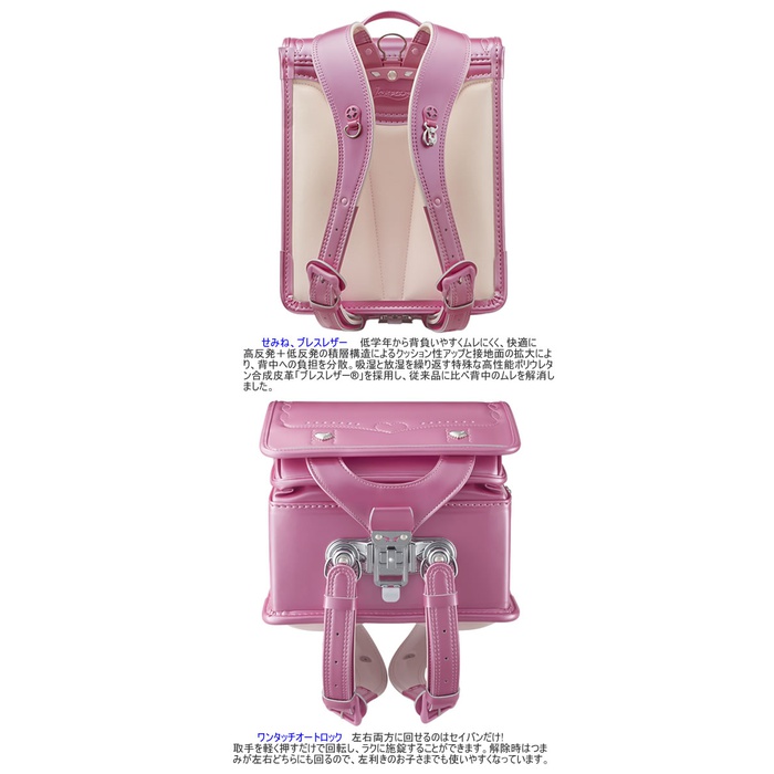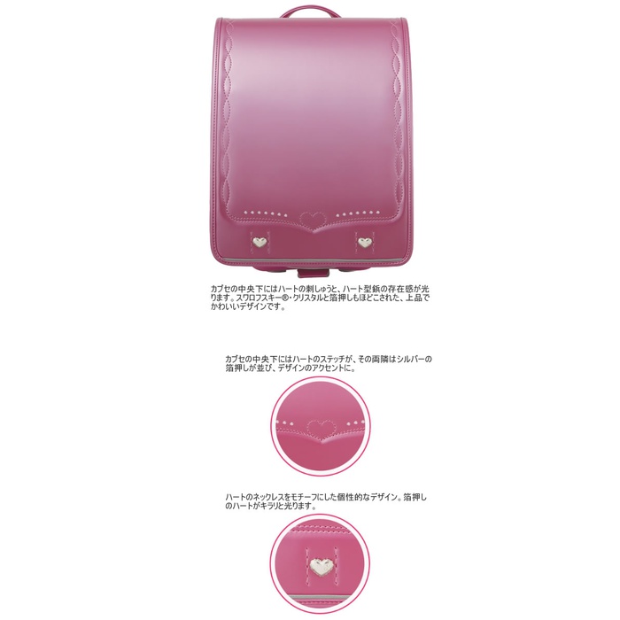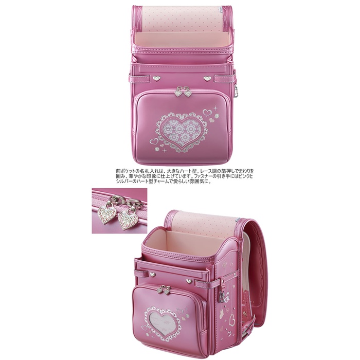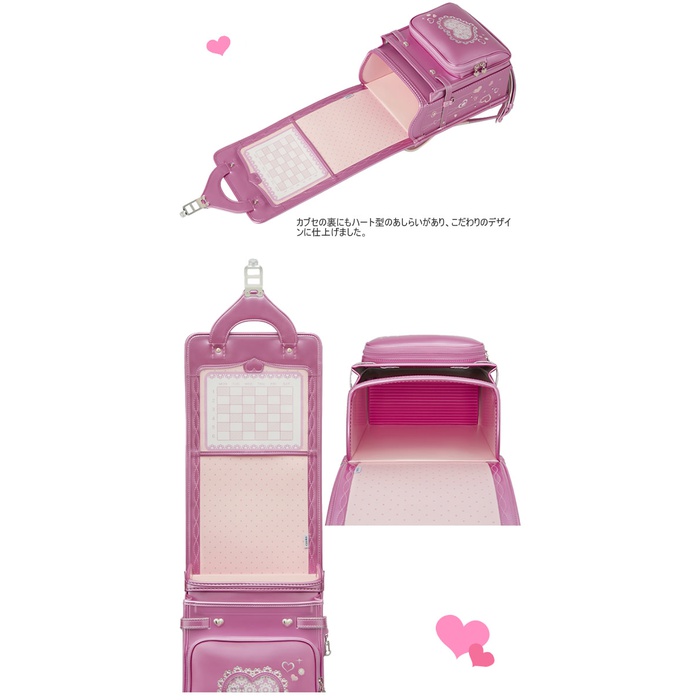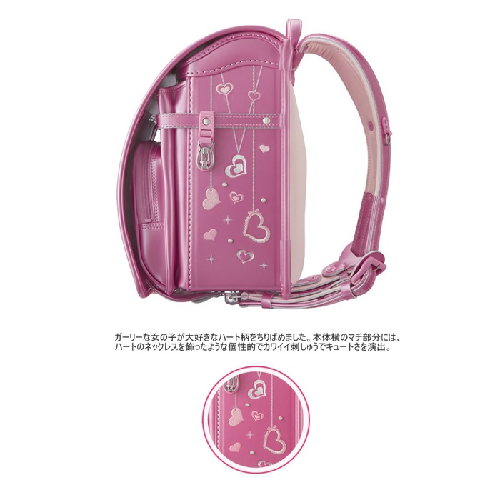 소녀다운 예쁜 모티브를 아로 새겼다「러브《피》 갈리」.하트의 넥크리스의 자수에,스와로브스키크리스탈과 박누르기가 반짝반짝과 빛나는 귀여운 디자인은,친구의 사이에(서)도 주목도 발군의 란도세루(초등학생이 어깨에 매는 가방)입니다.체감 중량을 가볍게 한다「천사의 날개(새털,깃)」야「3D어깨 벨트」「매미군요,breath 레더+W쿠션」등,저학년에게서 고학년까지,다루기 쉬어 짊어지기 쉬운 서포트 기능을 표준 장비 하고 있습니다.