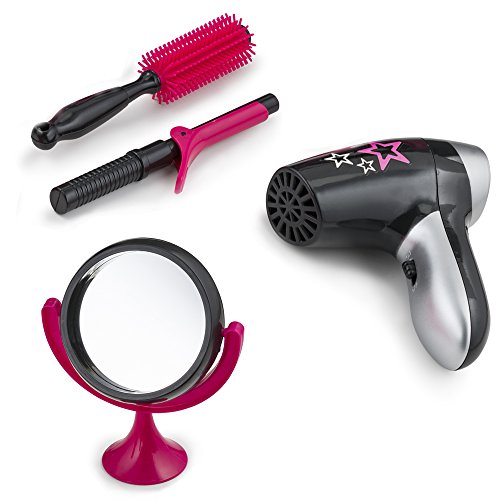 - Includes: Blow dryer [blows cold air], curler [pretend], table w/mirror, scissors [pretend], comb & more