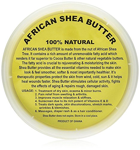 African Shea butter is a natural paste extracted from the nut (fruit) of the African Shea tree found mainly in Western Africa. It contains a rich amount of irremovable fatty acid which renders it far superior to Cocoa Butter and other natural vegetable butters. This fatty acid is crucial to rejuvenating and moisturizing the skin. Shea butter provides all essential vitamins needed to make the skin look and feel smoother, softer and most importantly healthier. Its therapeutic properties protect the skin from wind, coldmsun and it helps heal wounds faster. Shea butter stimulates cellular activity, fights the effects of aging and repairs rough, damaged skin. When pure and unrefined, it has a yellowish texture and gives out a nutty fragrance. Shea butter is most extensively used all over the world for its proven moisturizing and healing properties. In order to get the most benefit it is best to use it unrefined as it loses some of its key healing properties during the refining process.Feature