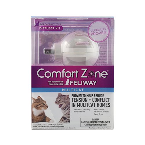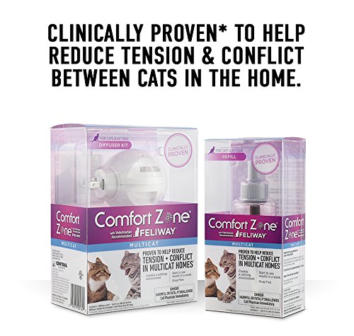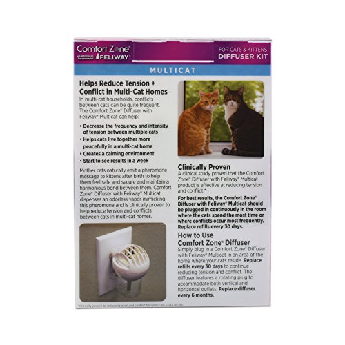 -. Feature : Helps Reduce the Frequency and Intensity of Tension & Conflict Between Cats in Homes with Multiple Cats. Helps to create a calming environment. / Veterinarian Recommended & Clinically Proven. / Contains 1 Diffuser and 1 48mL Refill. Refill lasts 30 days. / Use Comfort Zone Multicat together with Comfort Zone Feliway if the cats urine mark and scratch as well as have tension and conflict. / Satisfaction guaranteed or your money back!