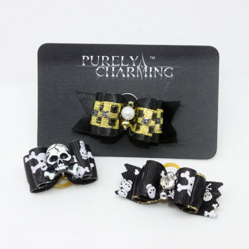 -. Binding : Misc. -. Brand : PURELY CHARMING - Pet Barrettes -. Color : Black, Gold -. EAN : 6931105414666 -. Feature : A PURELY CHARMING design / Set of 3 Barettes in different designs and materials as shown, for everyday and special occasions / Featuring ouchless elastics, individually handcrafted in the USA / Must-have accessories fit for your tail-wagging prince or princess! / Please find PURELY CHARMING Barrette sets in other colors in our Amazon Store -. Label : HYD -. Manufacturer : HYD -. PackageQuantity : 3 -. ProductGroup : Pet Products -. ProductTypeName : PET_SUPPLIES -. Publisher : HYD -. Size : Small -. Studio : HYD -. Title : PURELY CHARMING Pet Barrette / Hair bows for Dogs - Gothic Set - Skulls & Cross Bones (Pack of 3)