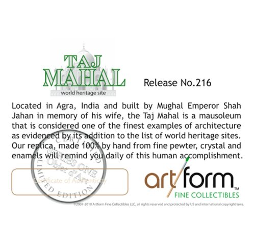 -. Binding : Misc. -. Brand : Objet d' Art -. EAN : 0845277002179 -. Feature : Made 100% by hand by expert metal handicrafters. / Beautifully boxed and includes certificate of authenticity, presentation gift card with matching envelope. / A beautiful, tasteful collectible. A gift worth giving and keeping for a lifetime. / Hand applied authentic Austrian crystal and European lacquers. / Part of the huge collection of jeweled trinket boxes from Artform Fine Collectibles. -. IsAdultProduct : 0 -. ItemPartNumber : AFOA10006 -. Label : Artform, LLC -. Manufacturer : Artform, LLC -. Model : AFOA10006 -. MPN : AFOA10006 -. PackageQuantity : 1 -. PartNumber : AFOA10006 -. ProductGroup : Home -. ProductTypeName : HOME -. Publisher : Artform, LLC -. Studio : Artform, LLC -. Title : Objet D'Art Release #216 "The Taj Mahal" World Heritage Site India Temple Handmade Jeweled Metal & Enamel Trinket Box -. UPC : 845277002179 -. Warranty : 90 day warranty against manufacturer defects