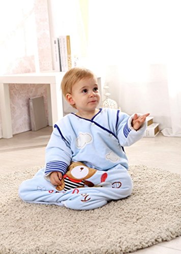 Feature : Winter baby sleeping bag with REMOVABLE long sleeves made with soft cotton fleece chambray featuring bear and bunny embroidery. Can be worn in two ways Vest or Long Sleeve sleeping bag / Generous body fit to let body move and kick, promoting healthy body development / Maximum versatility: Both shoulder snaps and two sides zipper for easy dressing and diaper changes; Opens completely flat for easy dressing. / Soft Cotton Fleece creates a micro-climate around baby's body