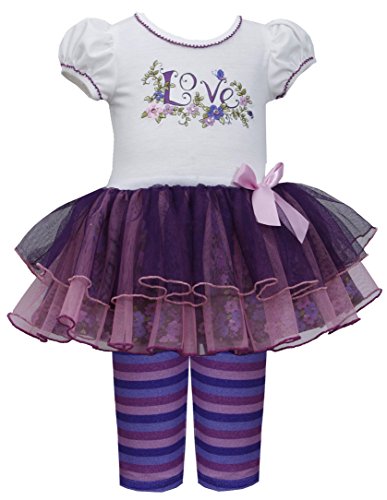 -. Feature : Cap-sleeve knit-to-tier-mesh tutu dress; 'Love' screen P.R.Int; embroidered floral details with sparkling jewel accents / Stripe knit legging pants; elastic waistband / Machine wash. / Imported (Sri Lanka). / Matching/Coordinating sister styles available in sizes 3M-6X, reference style BNJ-31264B.