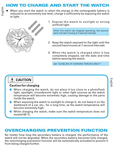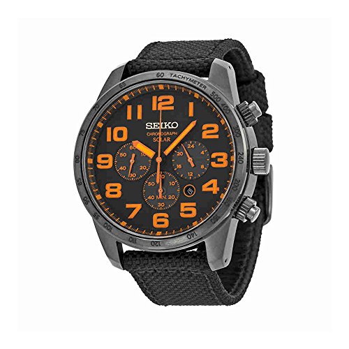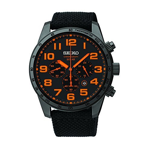 Studio : Seiko Publisher : Seiko Binding : Watch Product Description Black PVD stainless steel case with a black fabric strap. Fixed black PVD bezel. Black and orange dial with orange hands and Arabic hour markers. Minute markers around the outer rim. Dial Type: Analog. Luminescent hands and markers. Date display between 4 and 5 o'clock position. Chronograph - three sub-dials displaying: 60 second, 60 minute and 24 hour. Quartz movement. Caliber v175 engine. Scratch resistant Hardlex crystal. Solid case back. Case diameter: 44.5 mm. Case thickness: 12.1 mm. Round case shape. Band width: 28 mm. Tang clasp. Water resistant at 100 meters / 330 feet. Functions: chronograph, date, hour, minute, second. Casual watch style. Seiko Sport Solar Black and Orange Dial Chronograph Mens Watch SSC233. 0