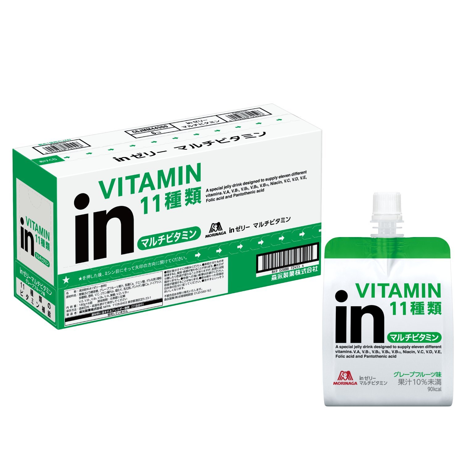 商品サイズ (幅×奥行×高さ) :245mm×81mm×128mm 内容量:180g×6個 カロリー:1袋(180g)当り:熱量 90kcal たんぱく質 0g 脂質 0g 炭水化物 22.5g ナトリウム 43mg ビタミンA 150~370μg ビタミンB1 0.34~0.75mg ビタミンB2 0.37~0.70mg ビタミンB6 0.34~0.67mg ビタミンB12 0.67~2.4μg ナイアシン 3.7~7.1mg ビタミンC 80~210mg ビタミンD 1.7~7.0μg ビタミンE 2.7mg 葉酸 67~270μg パントテン酸 1.8~7.2mg ビタミンK・ビオチン 0μg 原材料:果糖ぶどう糖液糖、グレープフルーツ果汁、乳酸Ca、クエン酸、ゲル化剤(増粘多糖類)、香料、V.C、クエン酸Na、塩化K、乳化剤、パントテン酸Ca、ナイアシン、V.E、V.B1、V.B2、V.B6、V.A、葉酸、V.D、V.B12