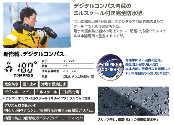 デジタルコンパス内蔵のミルスケール付き完全防水型。