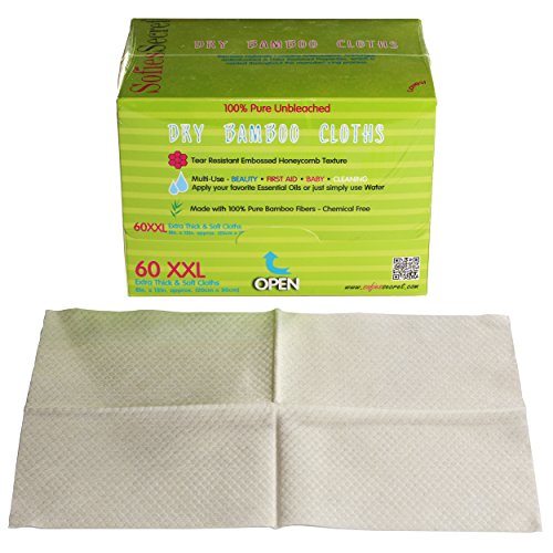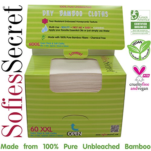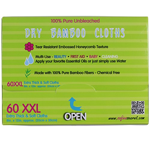 SofiesSecret 100% Unbleached Bamboo DRY Wipes, Extra Thick. XXL, Refill 60 Count – Multi-Use: Beauty, First Aid, Baby, Cleaning, Extra Thick, Ultra Soft 8in. X 12in.
