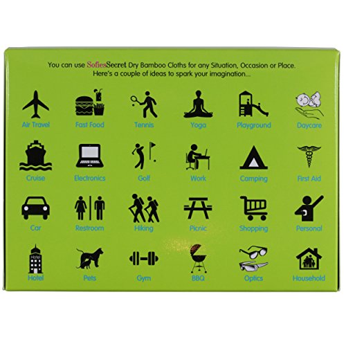 MULTI-USE: SofiesSecret Dry Bamboo Cloths can be used for Beauty, First Aid, Baby, Cleaning, Air Travel, Cruise, Car, Hotel, Fast Food, Electronics, Restroom, Pets, Tennis, Golf, Hiking, Gym, Yoga, Work, Picnic, BBQ, Playground, Camping, Shopping, Optics, Daycare, Personal Care, Household and anywhere else you can think of using it.
