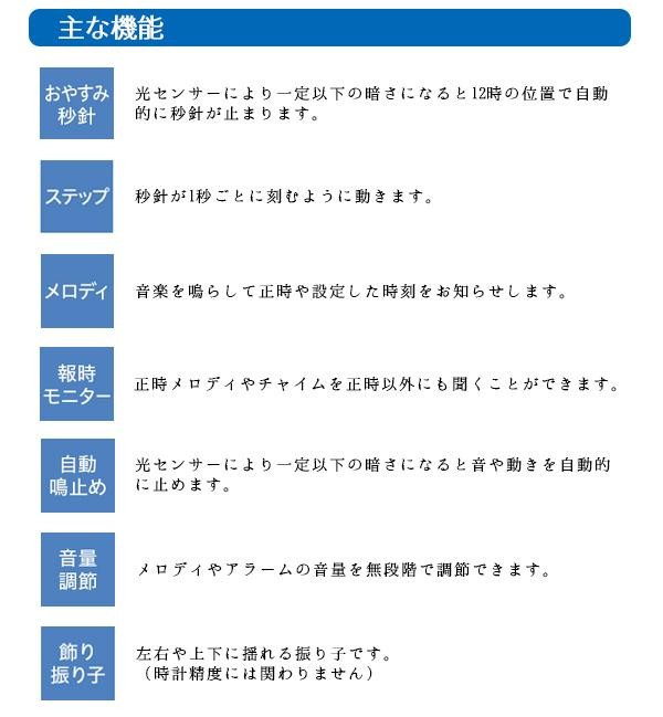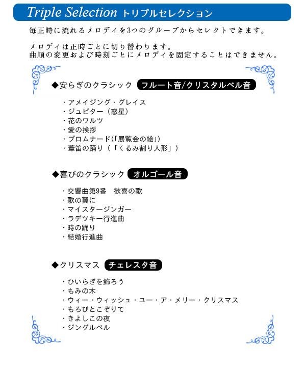 | 悠々と揺れる振り子が優美な時をお届けします。毎正時に流れるメロディを3つのグループからセレクトできます。 |