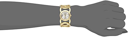 -. Feature : Gold-tone watch featuring round silver-tone dial with four oversized markers and large open-circles link bracelet / Quartz movement with analog display / Mineral crystal dial window / Features jewelry-clasp closure and logo under 12 o'clock / Not water-resistant