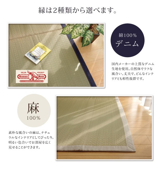 無染土と呼ばれる泥染加工をしていないい草を使用した商品です。無染土のい草はほこりも出にくく、しなやかでい草本来のすべすべとした肌触りの商品です。ヘリには同じ自然素材の綿を使用しており、自然の良さを実感して頂けます。国産(九州産)のい草を使用しており、一本一本が太く、表皮が厚く繊維がキメ細かいので弾力性があり、耐久性に優れています。い草には空気の自然浄化作用、湿度の調節作用などがあります。また汚れにくく、使用するうちに黄金色に変化し味が出ます。