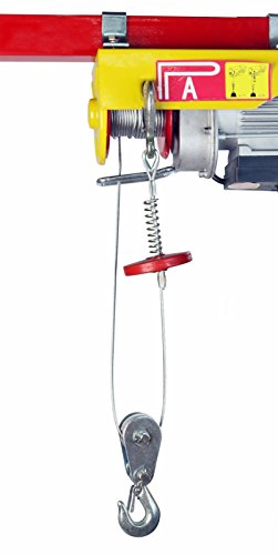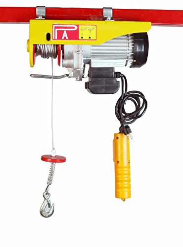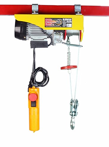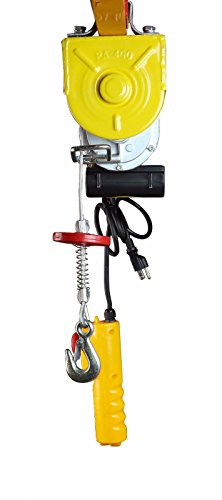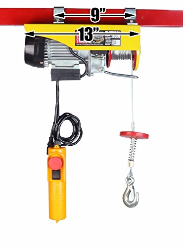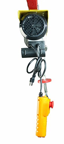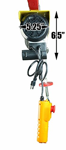 This electric hoist features a durable braided, anti-twist, high carbon steel cable, roughly 40 ft & 1/8" in diameter. SDT-EWH0440 electric hoist lifts up to 220 lbs with a single line, or 440 lbs with a double line lift. It lifts at a rate up to 40 FPM using single line, or 20 FPM using double line. With a 5 1/2' corded remote, you can power your load up and down from a safe distance, making it the perfect electric hoist for any shop or automotive garage and loading heavy equipment or removing small engines.
