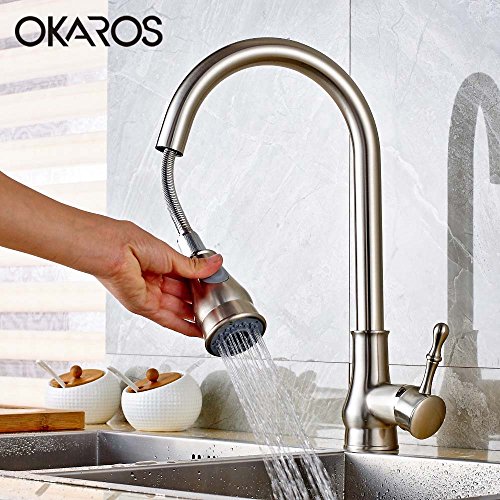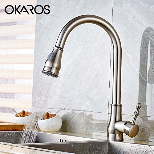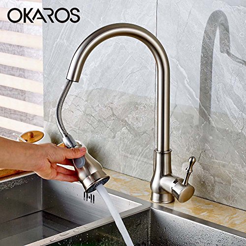 OKAROS Pull Down Kitchen Sink Faucet Pull Out Dual Sprayer Spout Kitchen Faucet Swivel Body Solid Brass Deck Mounted Single Handle Hot Cold Water Mixer Tap (Brushed Nickle)